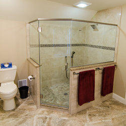 In the new layout, the tub was eliminated to make room for a large 74" x 56" neo-angle shower that included a large bench style seat and heavy glass door. The new 90" long double bowl vanity is complimented by a 24" linen closet, provided plenty of storage space. Beautiful porcelain tile was used throughout the floor and shower areas.