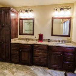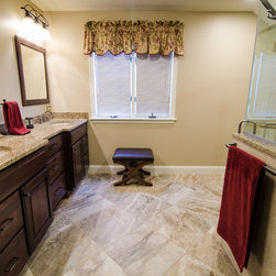 This master bathroom started life as a typical mid sized bathroom that had a rarely used drop-in whirlpool tub and platform that ate up a third of the floor space. This left little room for a 48" fiberglass shower, small double bowl vanity and toilet closet.