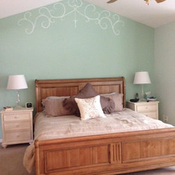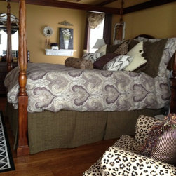 Ethan Allen Robyn Sleigh Bed in Mushroom finish. Lucy Bedside Chest. Carlisle Glass table lamp.