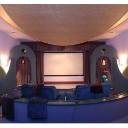 This colorful and fun home theater is the perfect place for family fun! The custom curved acoustical panels allow for a real movie experience. Reclining seats and paired with a custom curved sofa for seating for over 20! The curvature adds a whimsical twist to a classic room. Dramatic lighting and...