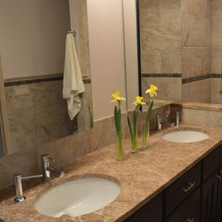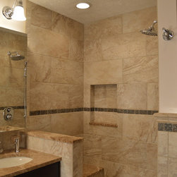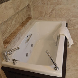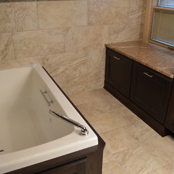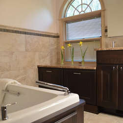A longer space of 13'x7.5' in this master bath includes both a shower and freestanding paneled tub by Jason AirMasseur. Tiled walls and porcelain flooring were selected with marble vanity countertops and contemporary styled faucets in "Align" by Moen. Deep rich stained beech wood cabinets by Custom Cupboards were also used to panel the tub. Niches were designed to accommodate bottles and soaps. Towels are stacked in large pull-out window seat drawers with full extension glides.