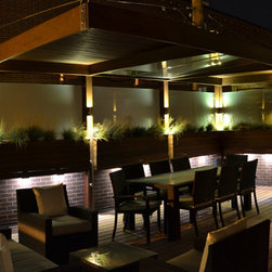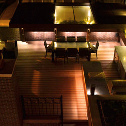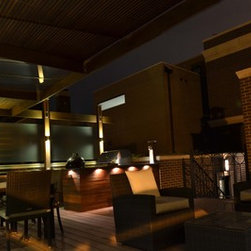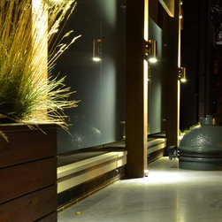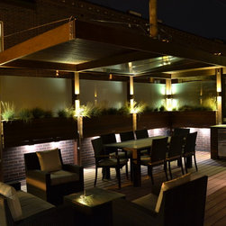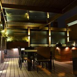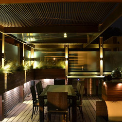 A modern outdoor space featuring a floating ipe and glass pergola.