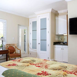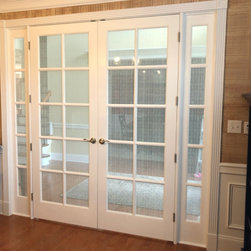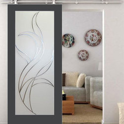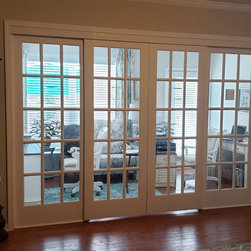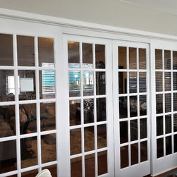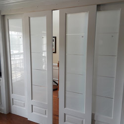 A pair of 8' wood and glass doors used to modernize this bedroom suite. Unique closet doors feature a tri-panel frosted glass design with pine door frames painted white. These interior doors may be used as an alternative to conventional French interior doors, as pocket doors or as a room divider...