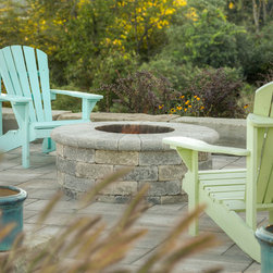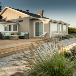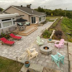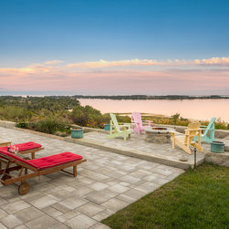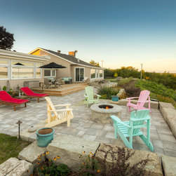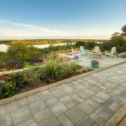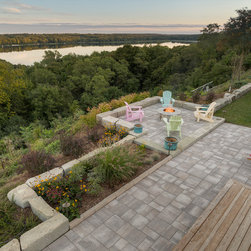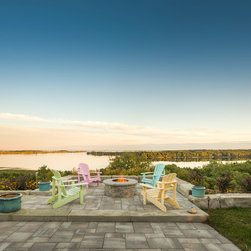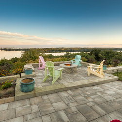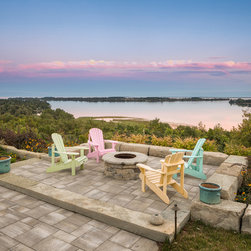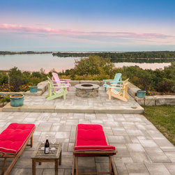 The linear nature of the home is echoed throughout the lines of the garden. A central walkway of premium concrete unit pavers links the garden spaces together. Several sitting terraces are accessed from this walkway, including a deck that leads out to the garden from two separate rooms in the home. The focal gathering area is a Fire Pit Terrace, perched beyond the crest of the hill in order to take in the commanding 180-degree views of the water. Angular limestone boulders provide definition and separation from the natural growth along the slope. The planting beds of natural grasses shrubs and perennials provide a transition from the manicured lawns to the natural slope side growth.