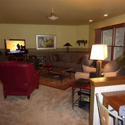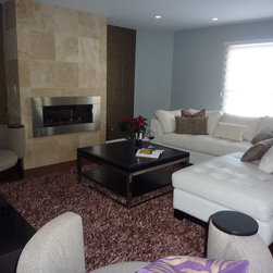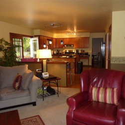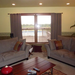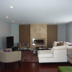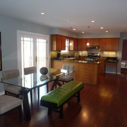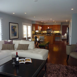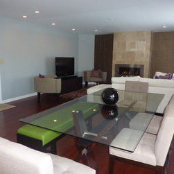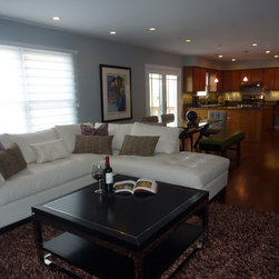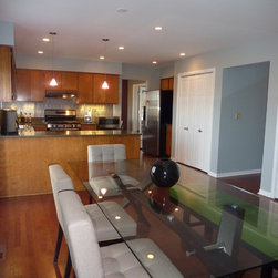 What a transformation this space has seen! From traditional to Mid-Century modern in just a few short weeks. By eliminating the half-wall, it allows for a free flow of living and dining within reach of the kitchen. A direct use of overhead recessed lighting and the additional use of cherry hardwood floors provided a link between the two spaces allowing them to flow as one. The use of leather and fabrics in neutral palettes gave life to the artwork and a calm zen-like appeal to the space.