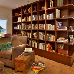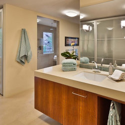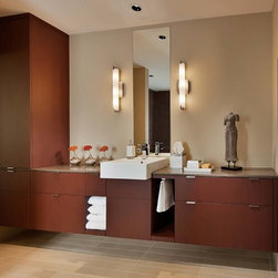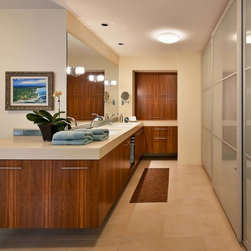 This home features deep red European style modern kitchen cabinetry constructed from Cherry. The Cherry is complemented by stainless steel accents to create a clean look. The minimal theme is carried out in the bathrooms as well, with cabinets and a bookshelf made of Emberwood.