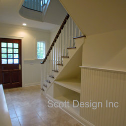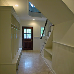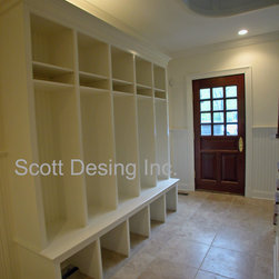 Simple cubbies with space below for shoes and boots, first platform for backpacks, several hooks for jackets, narrow space for incidentals and upper shelf for wire basket holding accessories.