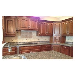 Countertop of Granite/Caledonia with the backsplash of honed durango cream field tile, Dorset Cast Stone Clover/Noche 2"X2" dots, a 16"x24" mural of Dorset Stoneshadow/Ibiza/Noche, North Shore Collection/Dark Harbor glass tile accent and Stone Liner/Tuscany Walnut with Pearl grout