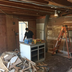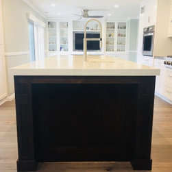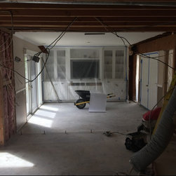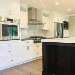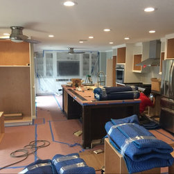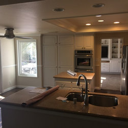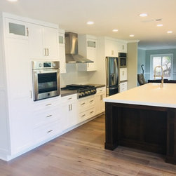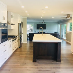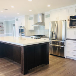 This was a fun project! With the client desiring more kitchen space, we didn't hesitate to remove the wall which divided the kitchen and formal dining room. This required structural engineering, concrete pad footing, structural beams and posts, and 2 hardy frames. We saw cut to the proposed island location as the sink was relocated to the new kitchen island. Both electrical and plumbing were ran into the trench. All new LED lighting was added along with relocating the HVAC vent register, and the hood venting. One window was removed as the new pantry was installed at that location. Custom cabinet was built per designer plans/ drawings and the installed. The island and wall cabinet is solid 3/4" maple wood with dove tailed drawers, full extension glides, and soft closing hinges at doors. The island was stained while the wall cabinetry was painted/ lacquered. I love the tile backsplash that the designer selected along with the Cambria solid surface countertops. All of the flooring was replace using glue down engineered wood flooring. Baseboards, crown molding, and doors casing were replace, and final painting was done to finish off this amazing and beautiful kitchen! Lastly, the project was schedule to take 12 weeks and finished 3 weeks early!!! Happy customers for sure!
