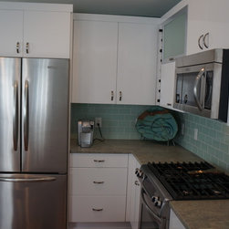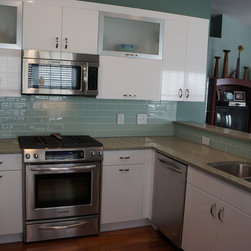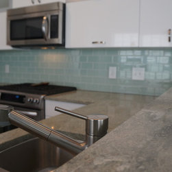 White high gloss cabinetry with green glass subway backsplash and green marble countertops