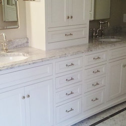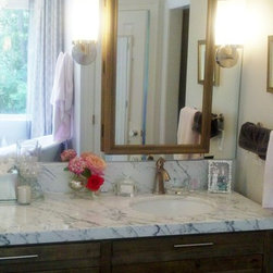 Master Bath Restoration hardware dresser converted to bath vanity, medicine cabinet mirror inset into mirror surround. Designed by Christine Rosario