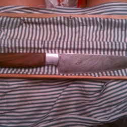 10in chefs knife made for Philadelphia Chef Clayton Brown. Pattern weld steel and black walnut handle