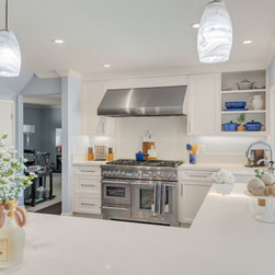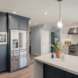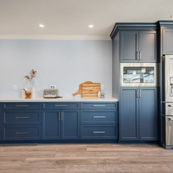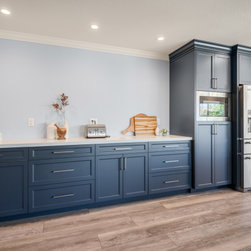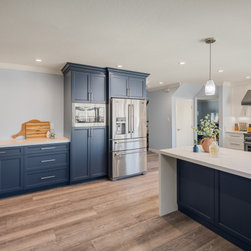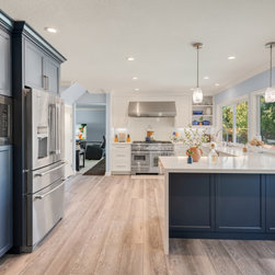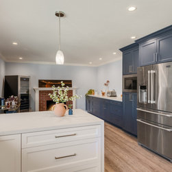 This new kitchen is now a wonderful space for a chief to prepare their favorite meals or learn new ones. With a brand-new gas range that hosts 6 burns and a griddle, makes an impeccable place for cooking multiple different types of food. The contrast of white and blue throughout is immaculate, white Dal Tile Niagara, crests like a waterfall over the custom blue peninsula that is the ideal spot for pulling up a chair and chatting with the chef as food is being made, maybe even sampling a bit.