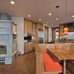 Features include the attached Mediterranean climate greenhouse and earth sheltered garage roof for growing food. Next, an 8.1 KW solar system generates electricity for the home and the 100% electric car. Plus, electrical usage was further reduced by installing hanging racks in the laundry room instead of a clothes dryer! Last, the home’s design is centered around a Tulikivi, Silverthorne’s first approved, solid fuel masonry heater.
