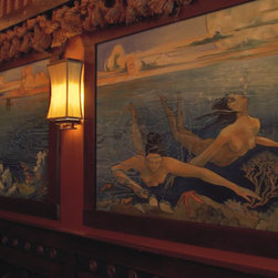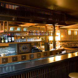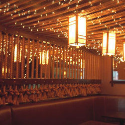 A cozy booth to eat a delicious meal- draped with ropes from a Shinto shrine, and Japanese lanterns giving off warm light
