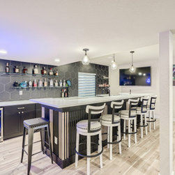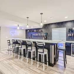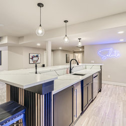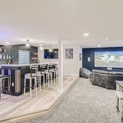 This contemporary basement finish includes a wet bar with glass shelves and a custom island design; home theater space; gaming area and custom half bath.