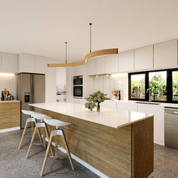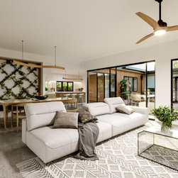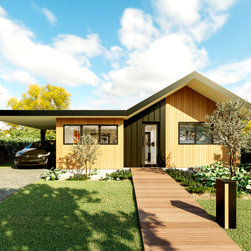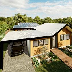 A generous open kitchen with walk in pantry, with floor to ceiling storage sits in the heart of the house with views to all living areas. Behind the dining, tucked in discretely is the full bathroom and hall to the bedroom zone. As with all our designs in our Zero Carbon series, the Master bedroom gets its own sanctuary with WIR and ensuite.