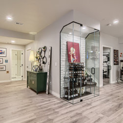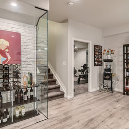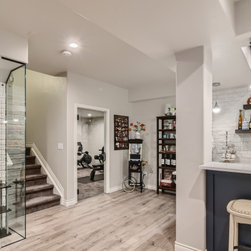 Beautiful modern basement finish with wet bar and home gym. Open concept. Glass enclosure wine storage