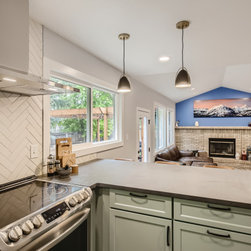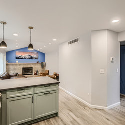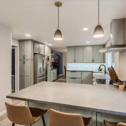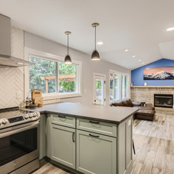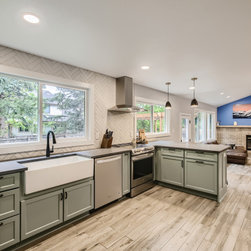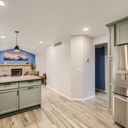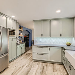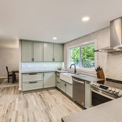 This kitchen renovation blends classic design elements with contemporary comfort, creating a space that’s both stylish and supremely functional. The cabinetry is painted in a soft sage green, bringing a touch of color and calm to the space while complementing the warm tones of the wood-look tile flooring.