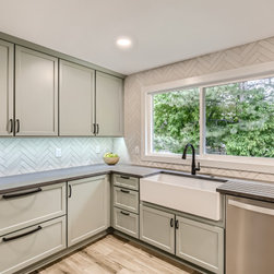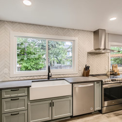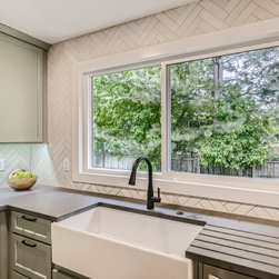 A full herringbone tile backsplash runs wall-to-wall for a cohesive and elevated feel, paired with sleek quartz countertops and matte black fixtures that add contrast and a modern edge. The oversized farmhouse sink, positioned under a large picture window, adds charm and utility—ideal for soaking pans or prepping produce with a view.