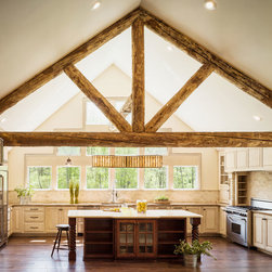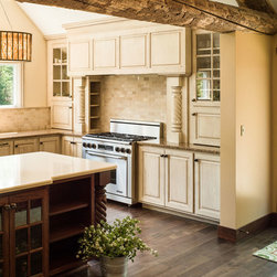 Painted and Glazed Oak kitchen for a fresh farmhouse kitchen. Quality custom kitchen cabinets built to fit a sloping ceiling. The island has twisted rope legs and a counter overhang for seating. Cambria Quartz Countertops.
