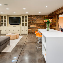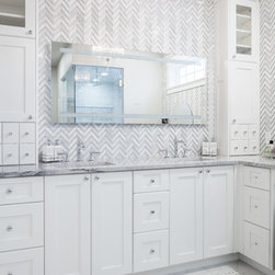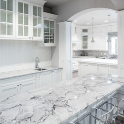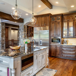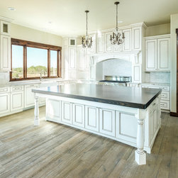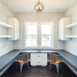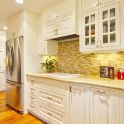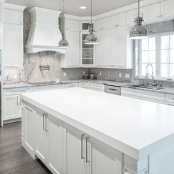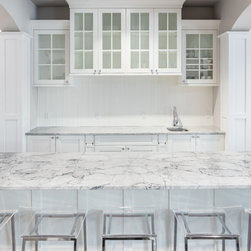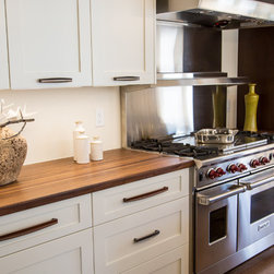 The natural wood of this butcher block top is highlighted by the clean lines & soft color of the shaker style cabinets.