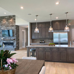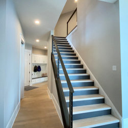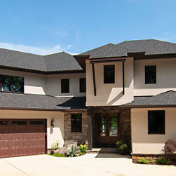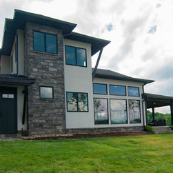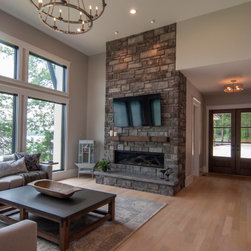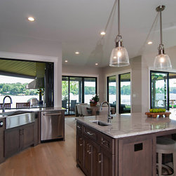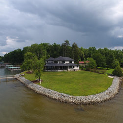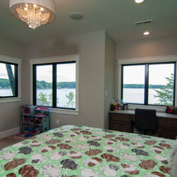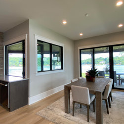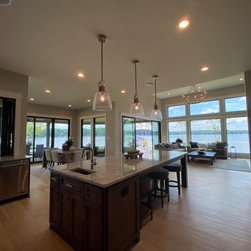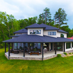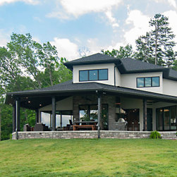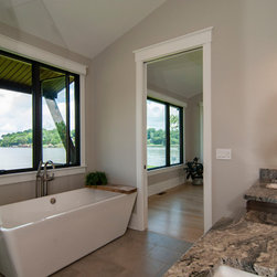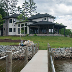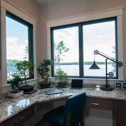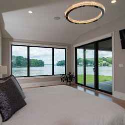 The biggest challenge was orienting the Great Room to have both a sunrise and a sunset view and this was accomplished by angling the main living space to be oriented with one large wall of glass facing NE and another large wall of glass facing NW, along with the Kitchen and Dining Room, as well. The lake views are spectacular from these rooms year round, no matter where the sun rises and sets on the lake, and the Master Bedroom and Bathroom both have a great sunset view. They also desired a Front Porch (street side) that would be protected by the wind, and have Southern sun on it, so they could sit outside in the winter and enjoy the sun, without the cold winter winds blowing through, so we created a recessed Porch on this side ample enough for two chairs,