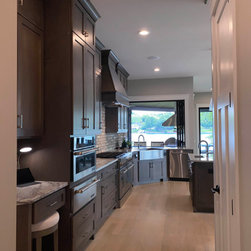 This custom lake home was designed for a challenging building lot on the lake, with fantastic views of the water, the sunrise and the sunsets, as well. The client desired lake views from all rooms possible, lots of natural light, while also incorporating a 3-car Garage and a ‘Surf Shop’ for all of their lake toys. Given that the lot is surrounded by water on 3 sides, it had 50’ deep lake side setbacks surrounding it and the septic field took up half the remaining site, as well, so there was a small, odd shaped building envelop left to design the house within. We were certainly up for the challenge, as many clients hire us because of our ability to creatively design on challenging building sites, and this client is a repeat client for us, as well, after having seen what we were able to create for them with their last home renovation.