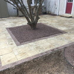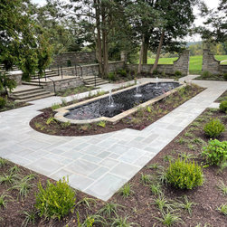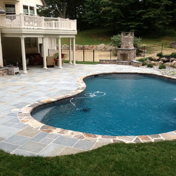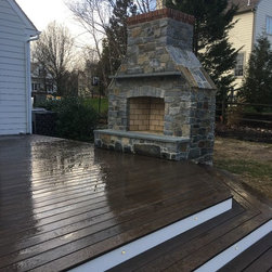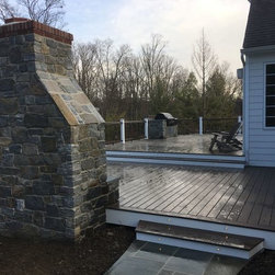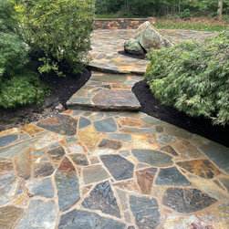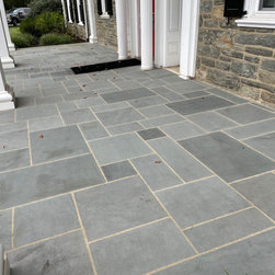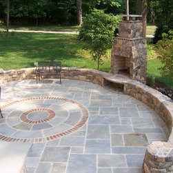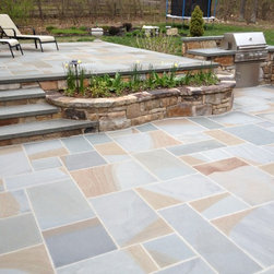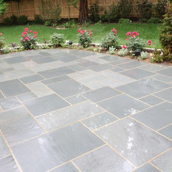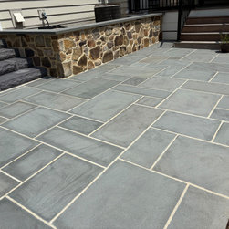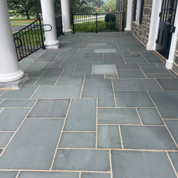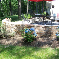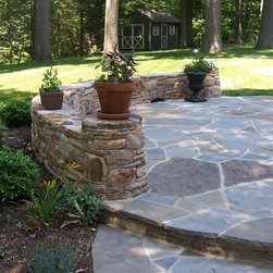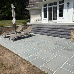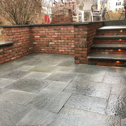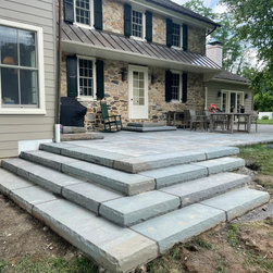 dry set PA blue flagstone patio with brick sitting walls and steps, and new roof