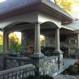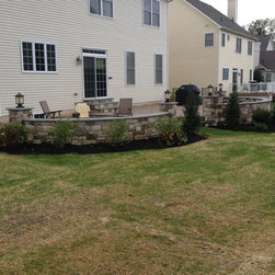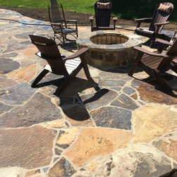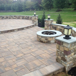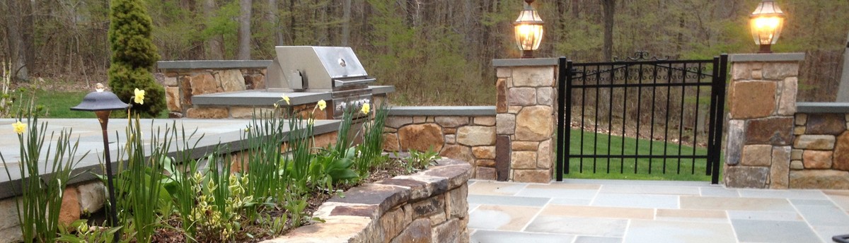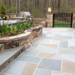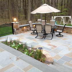 Paver patio with thin veneer natural stone walls, gas firepit all with Pa blue flagstone caps
