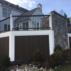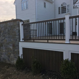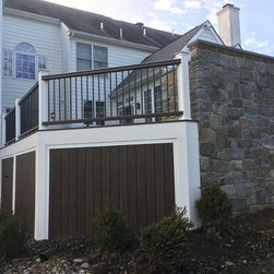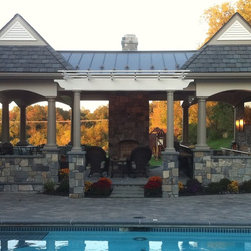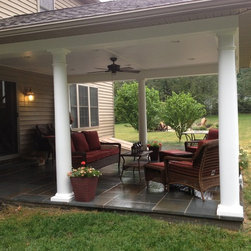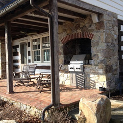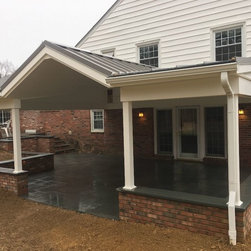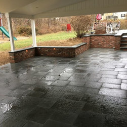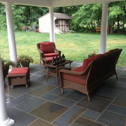 dry set PA blue flagstone patio with brick sitting walls and steps, with new roof