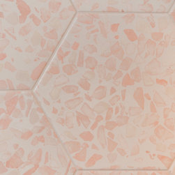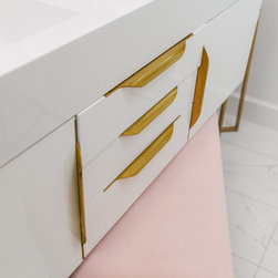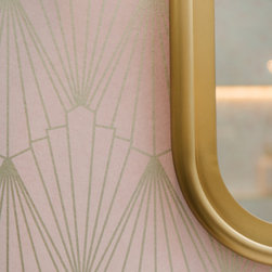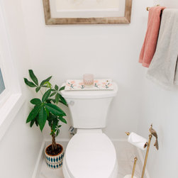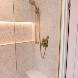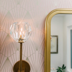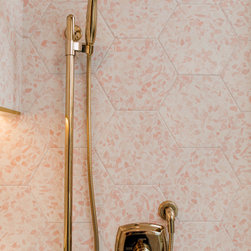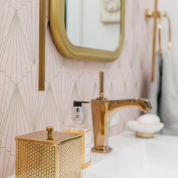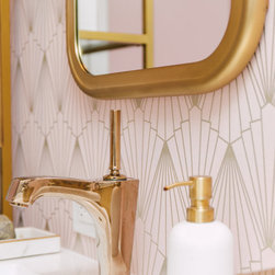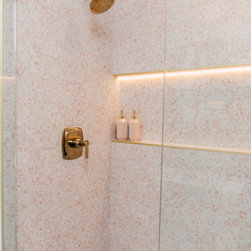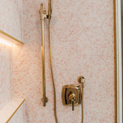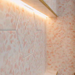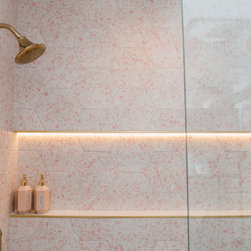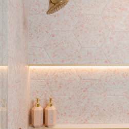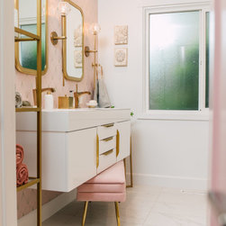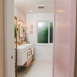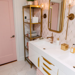 Hall bath redesigned to include a curbless shower and stunning gold accents. Complete with a wallpaper feature wall, floating vanity, large format floor tile, pink hexagon shower tiles and a lighted niche. And of course, a pink door!!!
