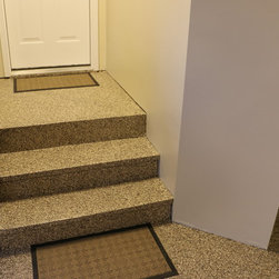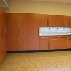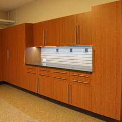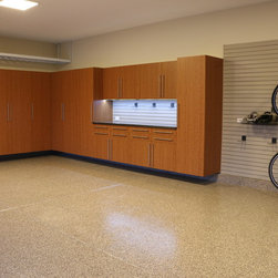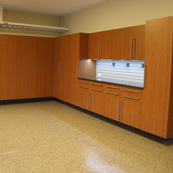 Complete garage makeover including cabinets, floor coating, slatwall organizers and overhead racks.