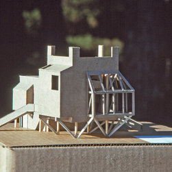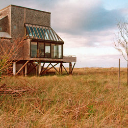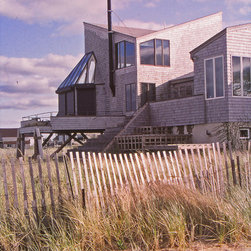 This major addition to a dilapidated beach house in Massachusetts was required to be supported on existing steel columns projecting from the sand dunes. Environmental regulations restricted any part of the new construction from touching the sand for fear of impacting the endangered dune grasses. A system of cantilevers and a solar collecting solarium underscore the solution.