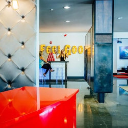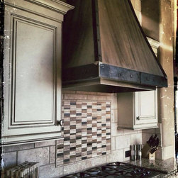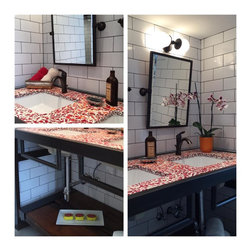 Blending of old and new in a 100 year old loft. Recycled glass, reclaimed wood and a custom iron vanity come together in this urban loft.
