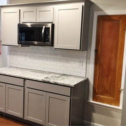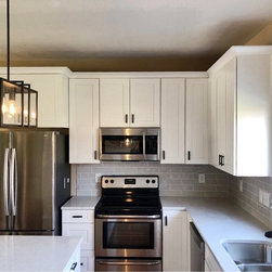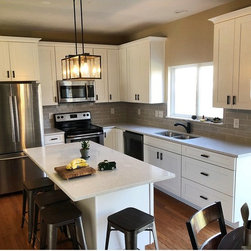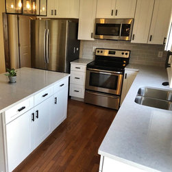 This family kitchen got an update with beautiful Timberlake Cabinetry, along with a light gray backsplash and stainless appliances.