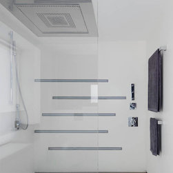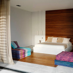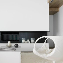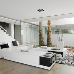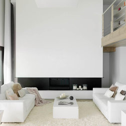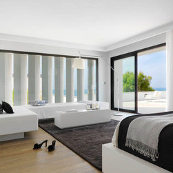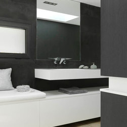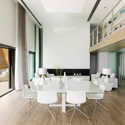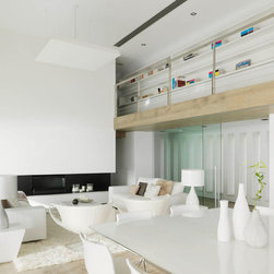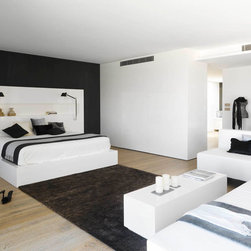 The top of the bulding houses a cube where the main suite is located. The whole room is decorated in white except for a black carpet that crosses the room and specific decorative objects in silver as a mannequin and a frame over the boudoir.