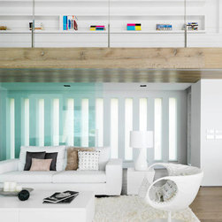 The house is divided into five areas. The service area can house five people and the decoration and furniture are all designed in white. The kid’s area, which includes the children’s rooms and playroom, is the only part of the house decorated in colours.