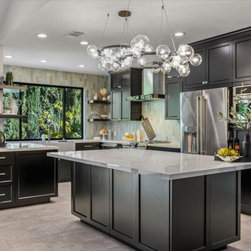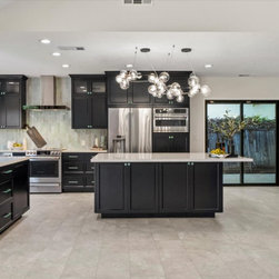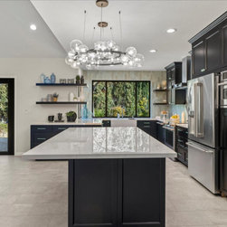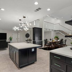 The Existing home had the standard 1970’s layout, a cramped and oak filled U-shaped kitchen tucked behind walls. The senseless upper cabinets over the peninsula blocked site lines while the massive boxy staircase lay right in the middle of the floor plan leaving the spaces feeling closed in and disconnected. Having lived in and falling in love with Hawaii, the focus of this design and whole house San Jose remodel was to embrace the exterior views of the greenery filled backyard while providing an open, modern layout.