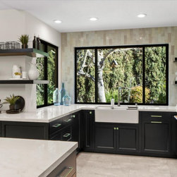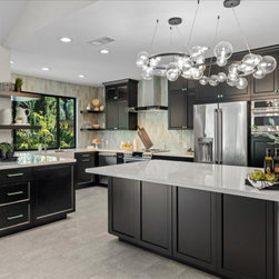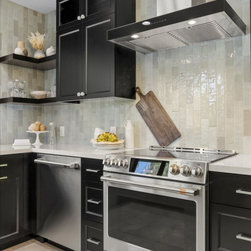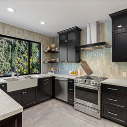 In this island inspired space, moody black cabinets and mixed blue and greens subway tile backsplash wraps around the entire kitchen. To break up the dark cabinets, floating shelves are positioned between the windows to maintain a light and airy look and custom made teal cabinet pulls. A tall appliance caddy and a massive island with seating for 6 prove this custom kitchen is built for entertaining.