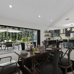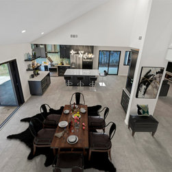 Tearing down the confining kitchen walls, relocating the staircase and an addition of a laundry room combined the living and dining areas into one open great room. From the moment you now enter this newly remodeled San Jose Home, you are greeted with Light pouring in from every direction. Large black framed windows and a nearly full wall panoramic door, allows expansive views of the outdoors and serves as a seamless extension of the home's great room. Grand vaulted ceilings, highlighting the dramatic floating staircase, levitating wood treads and glass railing brings drama and dimension creating modern centerpiece.