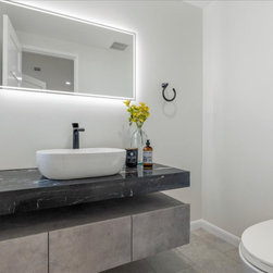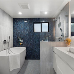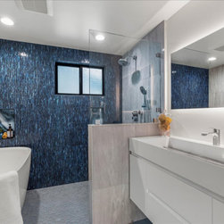Blue hues and modernity continue into the reconfigured hall bathroom. Designed as a wet room features a freestanding soaking tub, floating vanity and walk in curbless shower. A glass panel opens the room to natural light while the full tiled wall exudes luxury.