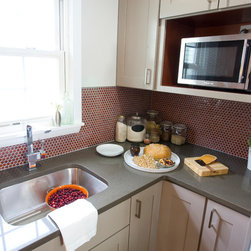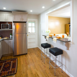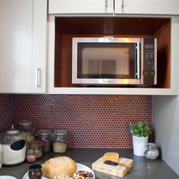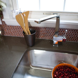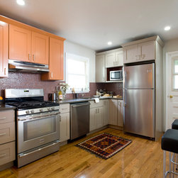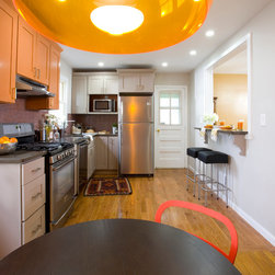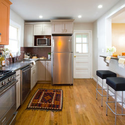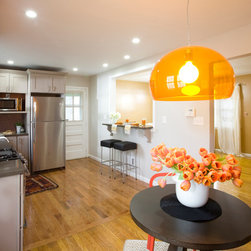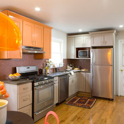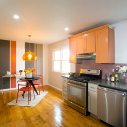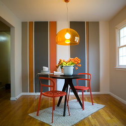 Traditional lines meets contemporary style in this updated eat-in kitchen. Pops of orange on the cabinets, chairs, pendant lamp, and striped feature wall as well as the red, circular tile backsplash bring modern-day touches to the otherwise traditional silhouettes found in the space. A bar in the...