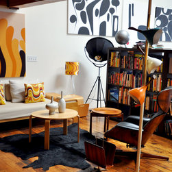Living area of an artist and designer's loft. Industrial blended with mid-century period pieces. Original artwork by Dee Speed. deedee9:14