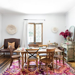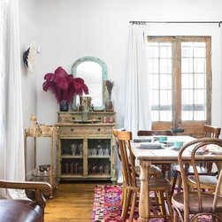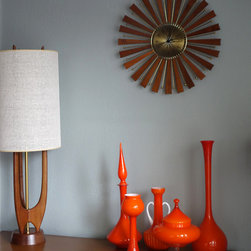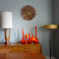 Mid century vintage glass gives focal pops of colour to the danish dining area in this California bungalow. Dee Speed. deedee9:14