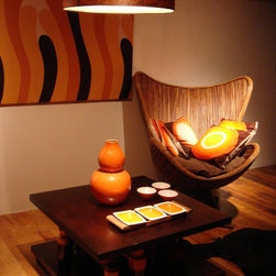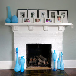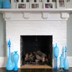 Mid century vintage glass gives focal pops of colour to the family room fireplace in this California bungalow. Dee Speed. deedee9:14