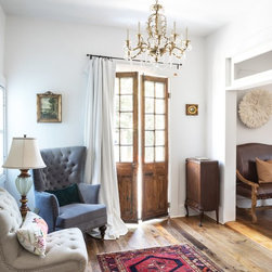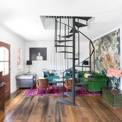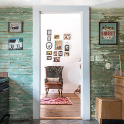 Entryway featuring veneer pendant lighting in an industrial artist's loft, softened by the use of wood and warm colours. Objects sourced from local mid-century shops. Mid-century collection of ecclectic period pieces in an artist's loft.