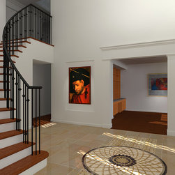 The underlying functional aspect of our studies was the house’s circulation. There were three separate stairways to navigate between three floors. Initially, the main stair was a key focus of the design to eliminate the circuitous path from the foyer to the kitchen with a direct path. As the program evolved we studied stacking the independent stairs into a grand stair. The resultant design benefit was a functional and aesthetic circulation path that served the entire house.