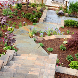 Alexandria Sloped Yard - Raised Patio, Fire Pit, & Water Feature