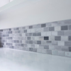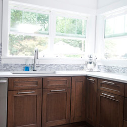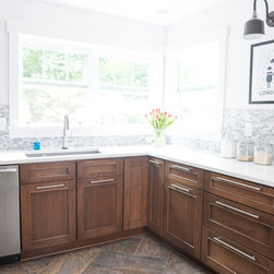 Plenty of light in this kitchen remodel by Angie! Paired with the rich, transitional cabinets the MSI Cashmere Carrarra countertops, light natural stone backsplash and white walls make this kitchen remodel feel incredibly open and airy. Large stainless pulls blend well with the appliances and don't distract from the overall beauty of the space.